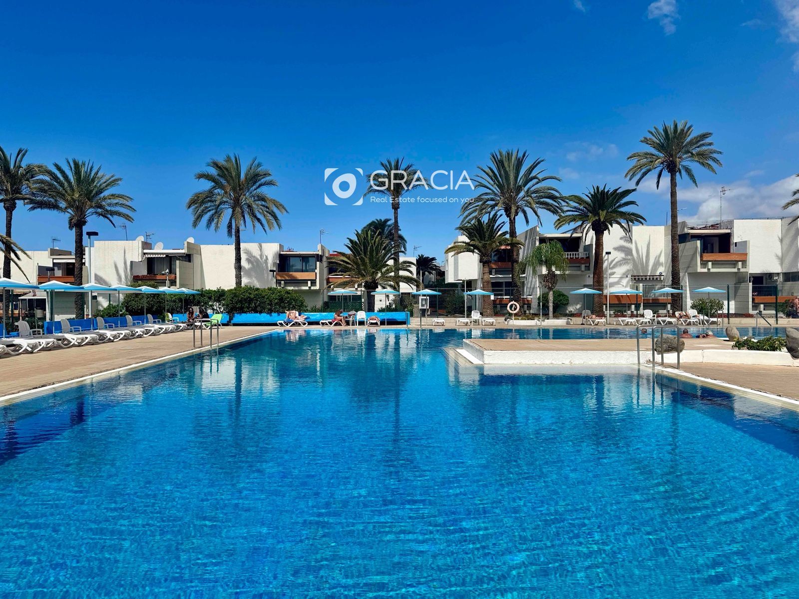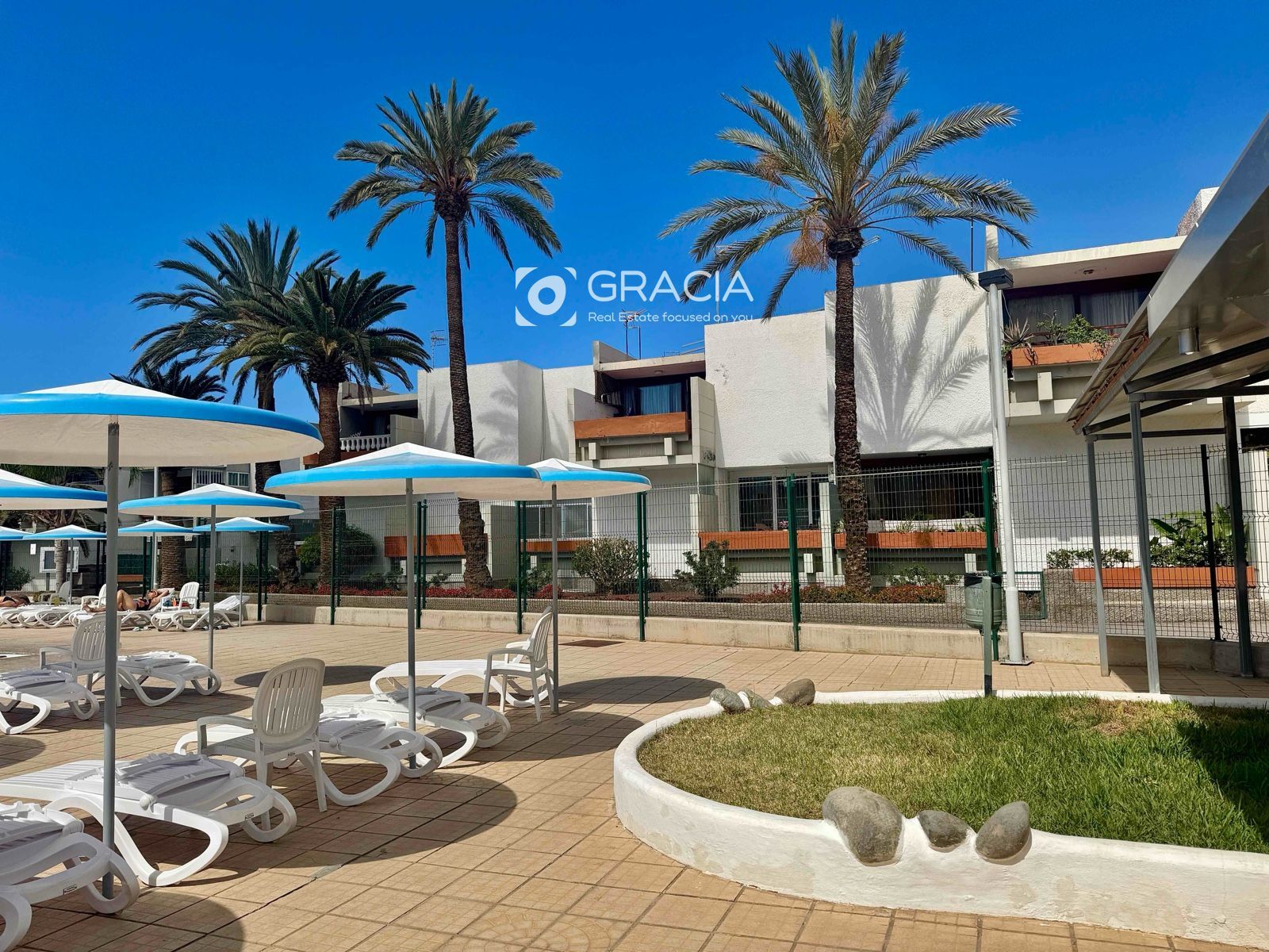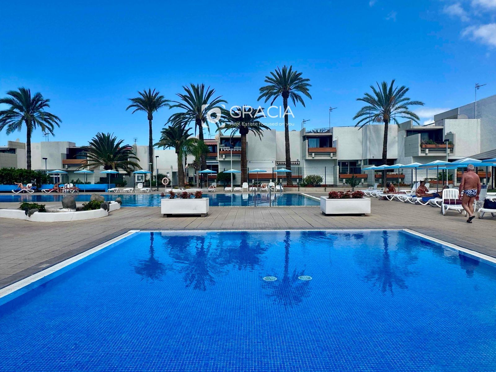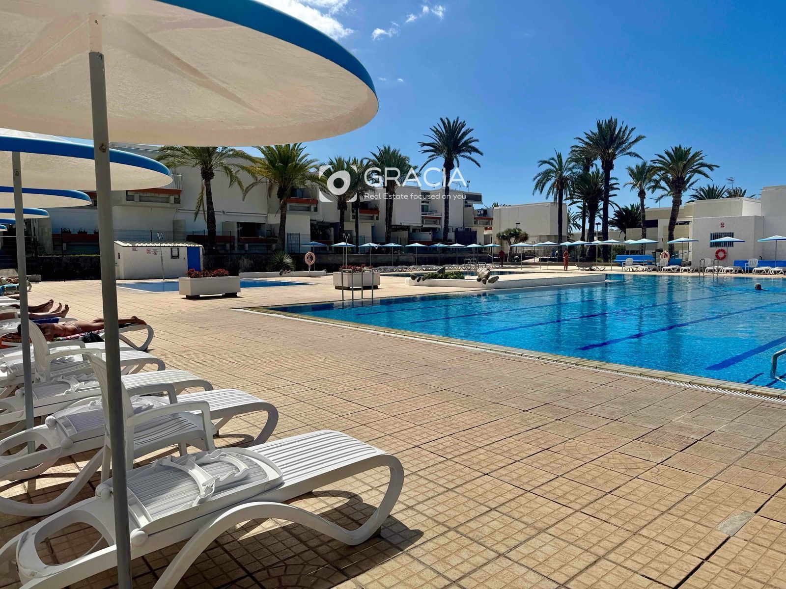 La comunidad se ha renovado también, es agradable pasear por ella, rodeada de jardines verdes y cuidados. Hay una amplia zona de piscinas, con tumbonas y sombrillas, una piscina grande y otra infantil. Es una zona de uso exclusivo de vecinos, con intimidad y muy cuidada.