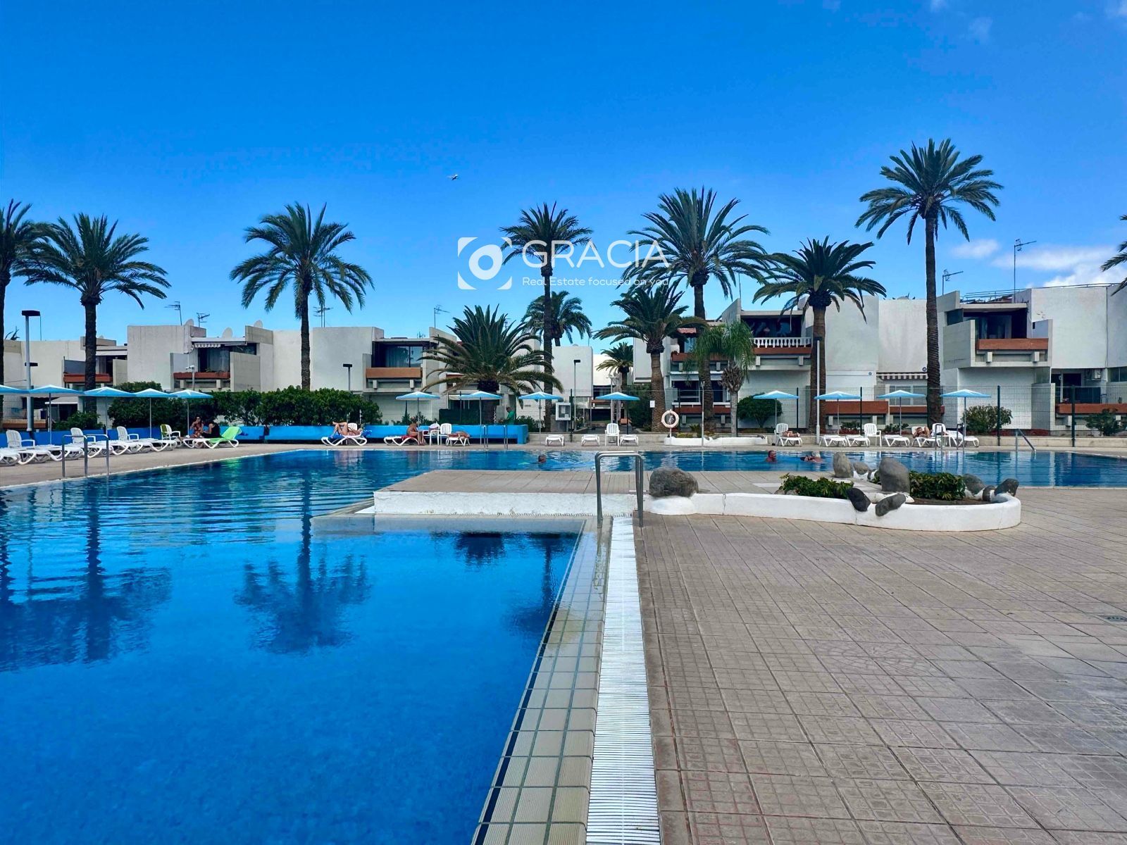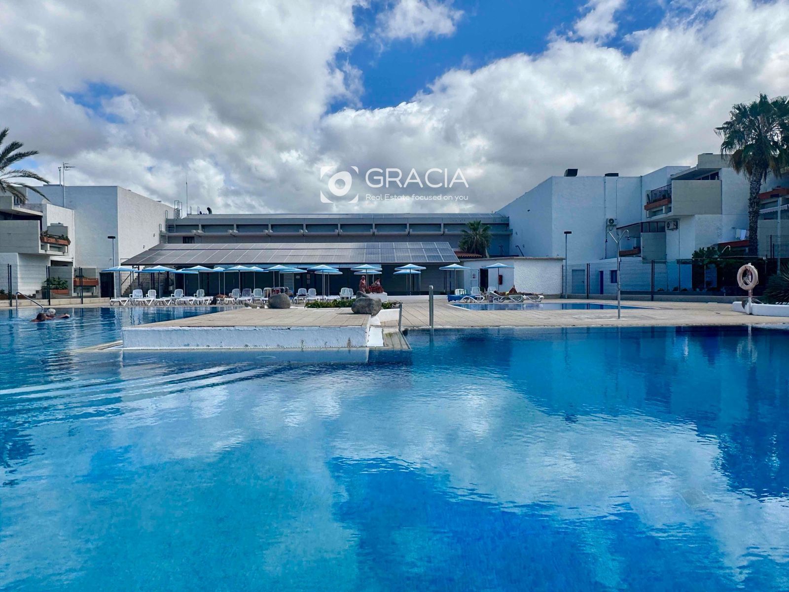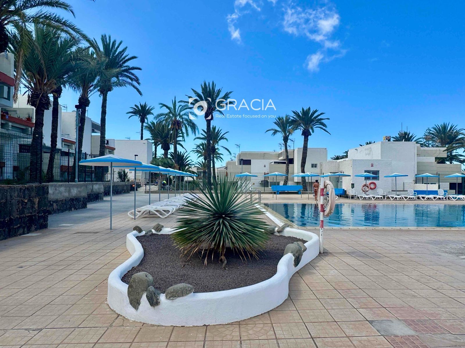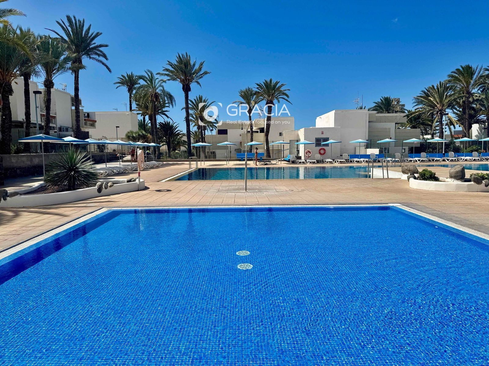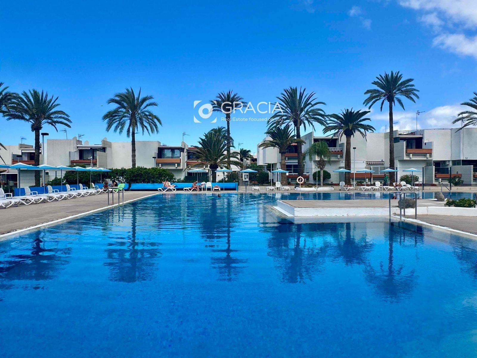 La comunidad se ha renovado también, es agradable pasear por ella, rodeada de jardines verdes y cuidados. Hay una amplia zona de piscinas, con tumbonas y sombrillas, una piscina grande y otra infantil. Es una zona de uso exclusivo de vecinos, con intimidad y muy cuidada.