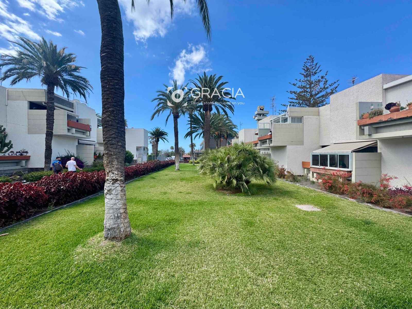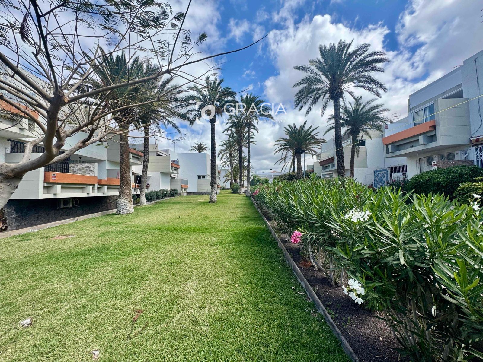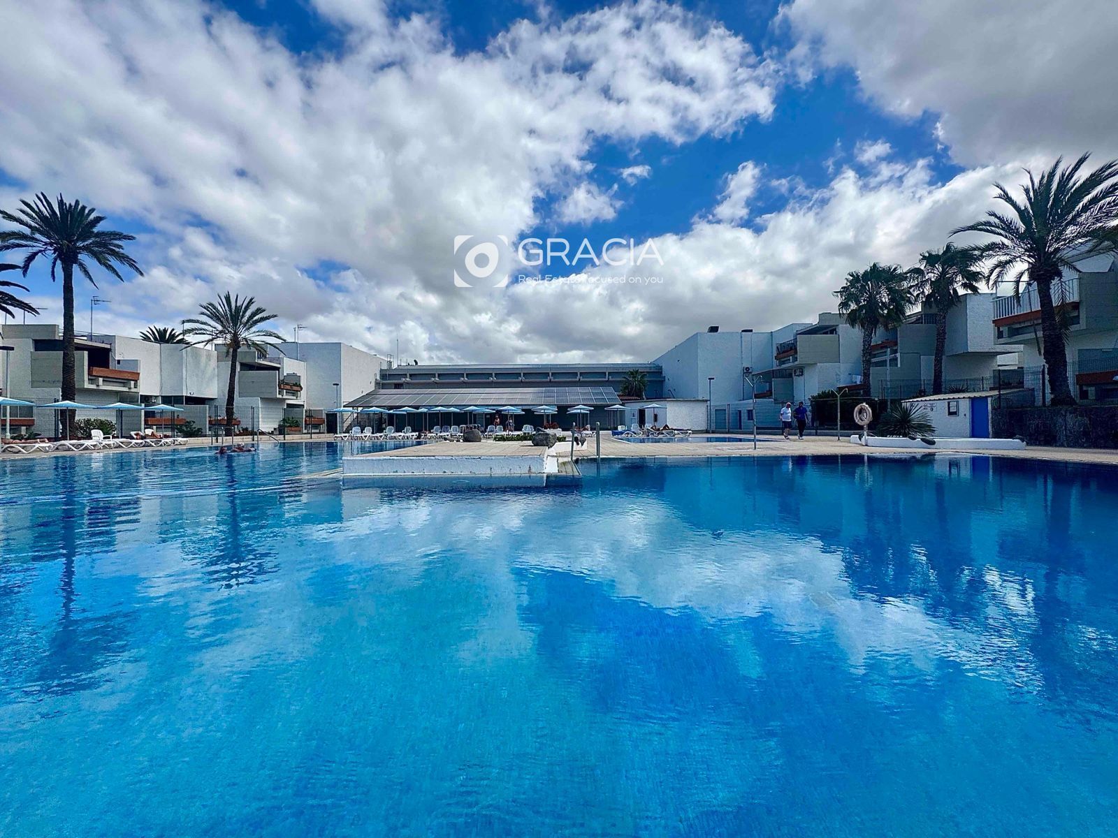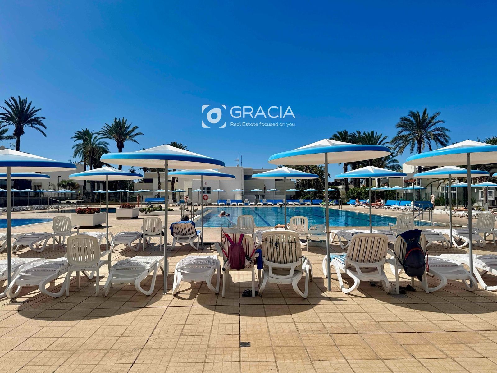 La comunidad se ha renovado también, es agradable pasear por ella, rodeada de jardines verdes y cuidados. Hay una amplia zona de piscinas, con tumbonas y sombrillas, una piscina grande y otra infantil. Es una zona de uso exclusivo de vecinos, con intimidad y muy cuidada.