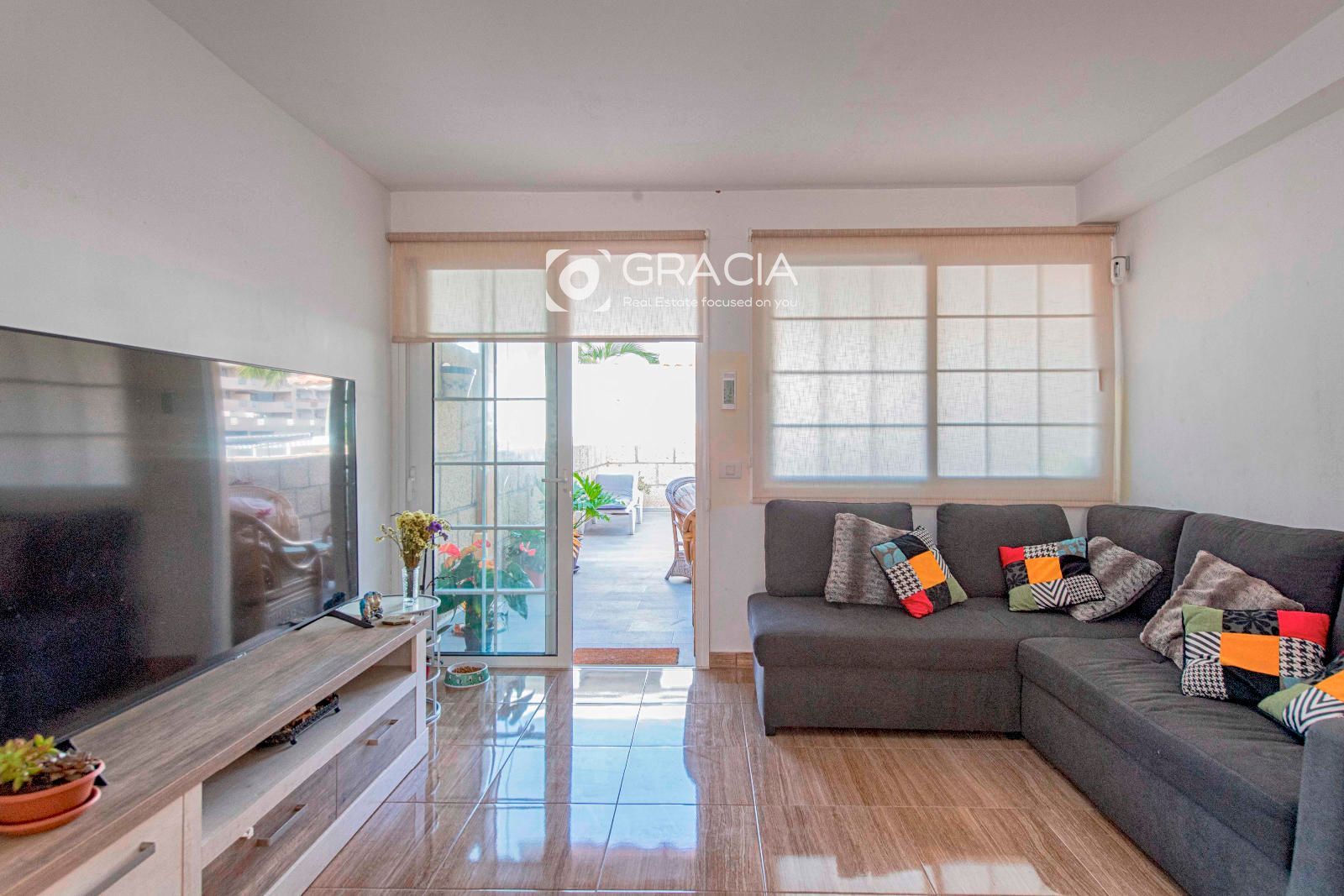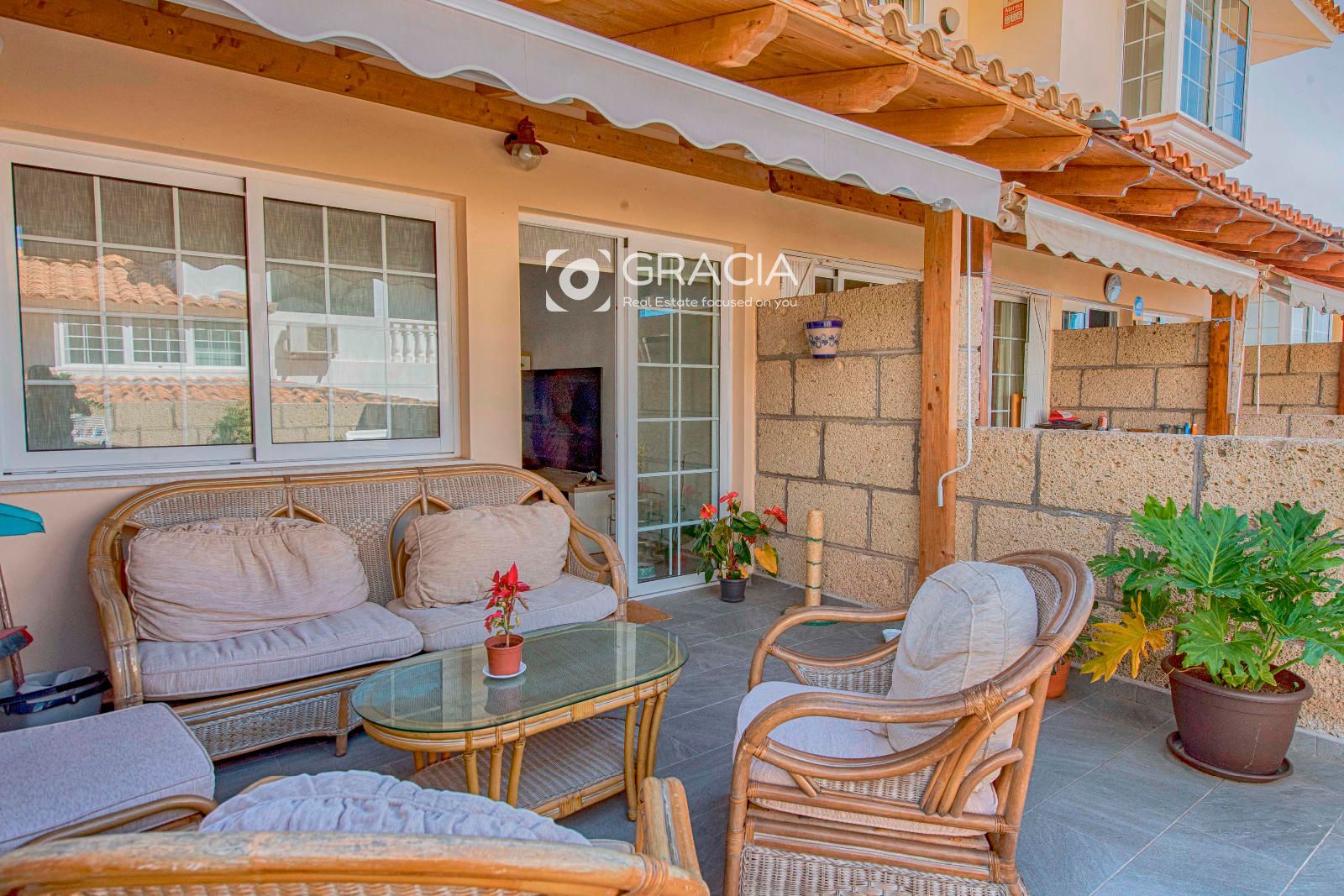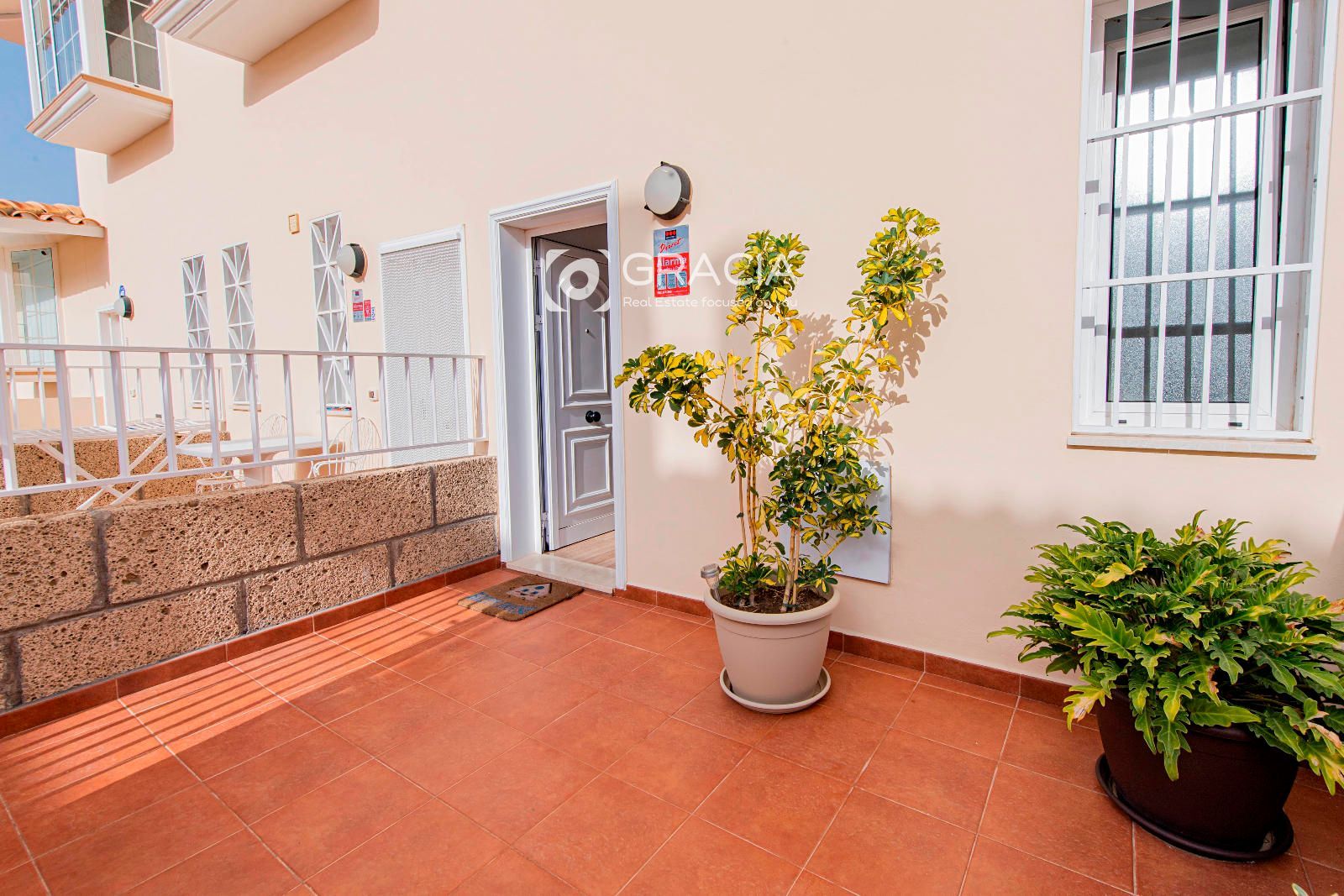 Ponemos a la venta un Adosado Duplex ubicado en una de las principales avenidas de El Palm-Mar, muy próximo a la zona de comercio y restauración, está renovado recientemente, perfecto para entrar a vivir, se vende con los muebles principales de la propiedad. La entrada principal tiene una pequeña terraza y la propiedad se distribuye en dos plantas. En la primera planta se encuentra el salón comedor y cocina americana con acceso directo a una amplia terraza, con parte techada a modo cenador, con un toldo recién instalado, espacio ideal para desayunar, almuerzos o momentos en familia. En esta planta encontramos también un cuarto de aseo amplio.