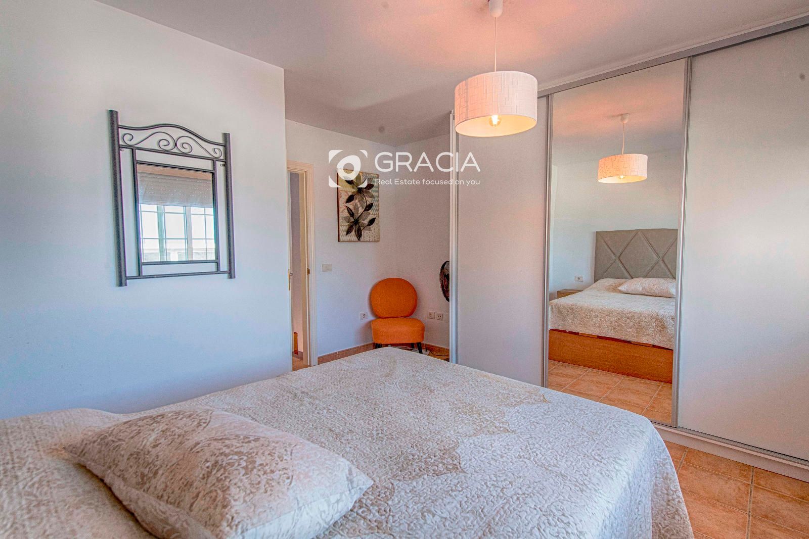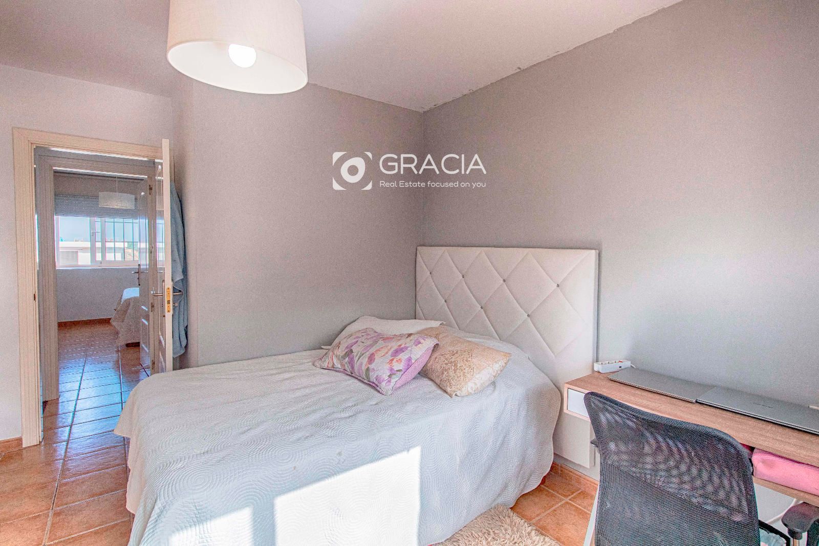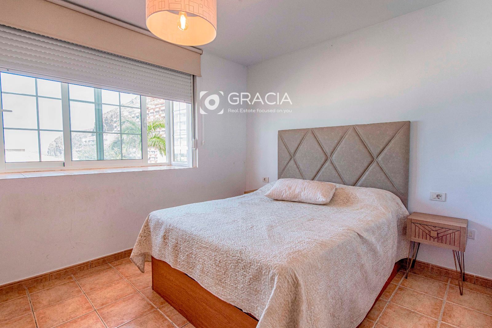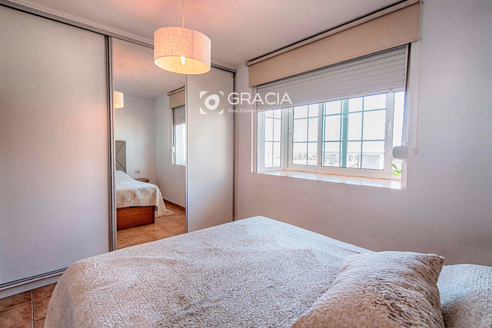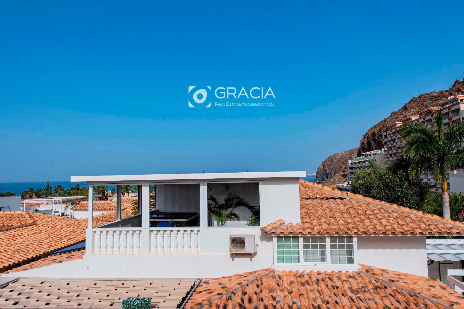 Desde el dormitorio principal hay vistas panorámicas al mar que se encuentra a pocos minutos caminando desde la propiedad. La principal playa de El Palm mar se encuentra a unos 500m de distancia.
