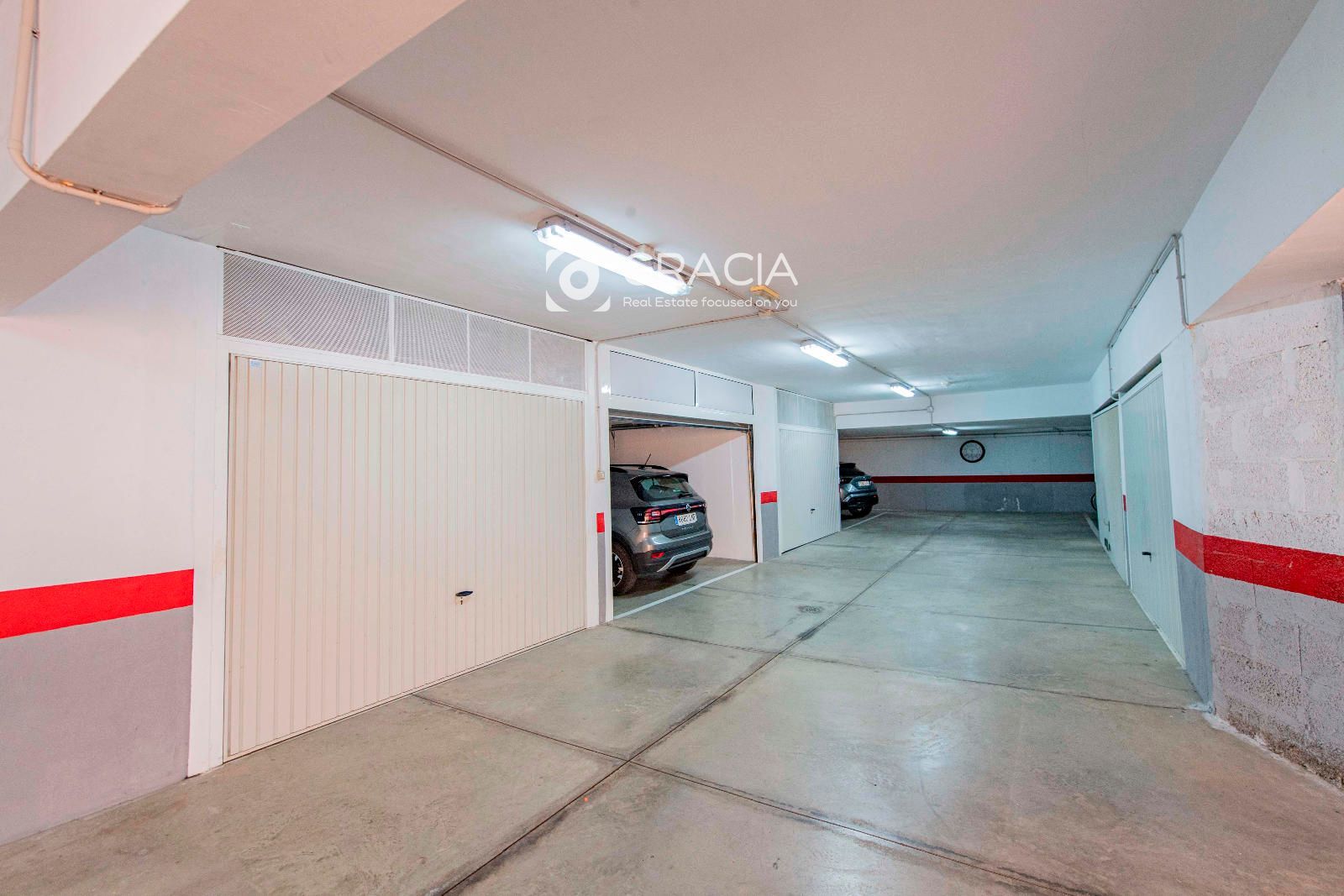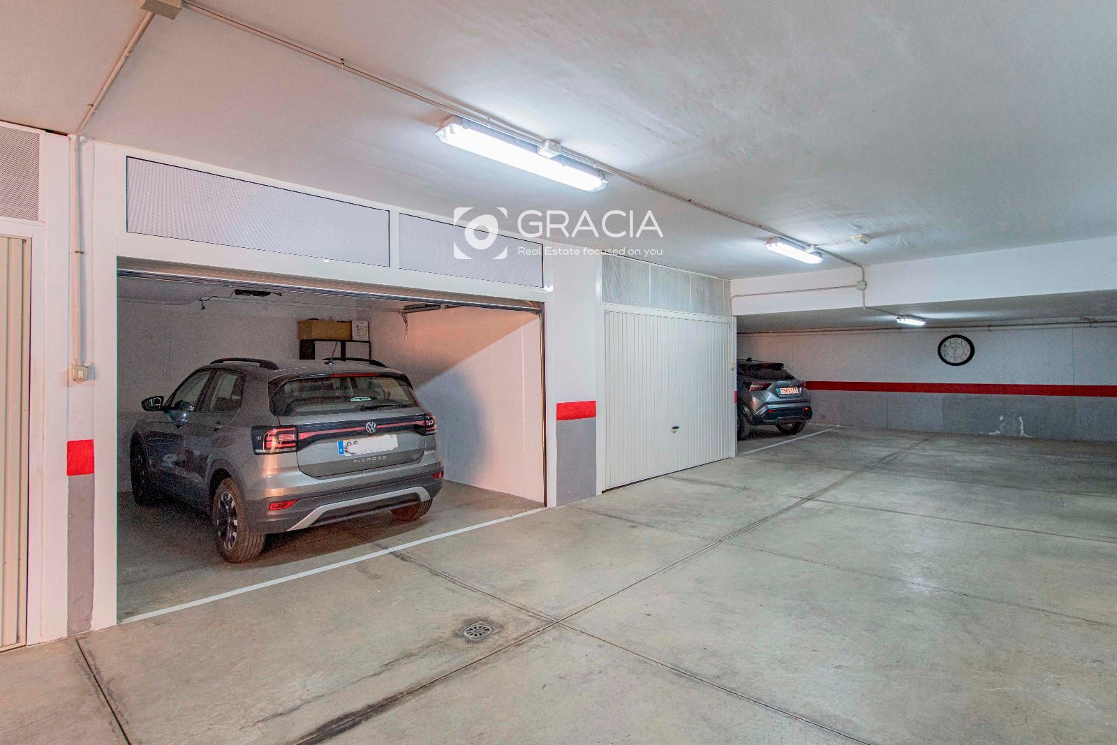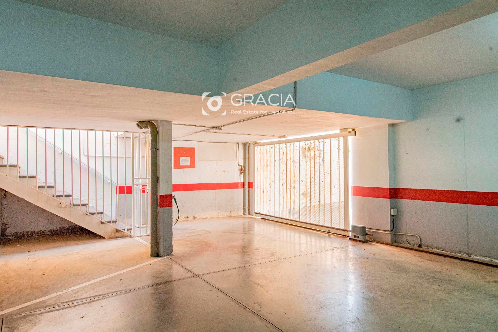 La propiedad incluye una plaza de garaje cerrada en el mismo edificio. Se accede desde fuera de la casa por unas escaleras y se cierra completamente con una persiana automática. Por ello sirve también de trastero.