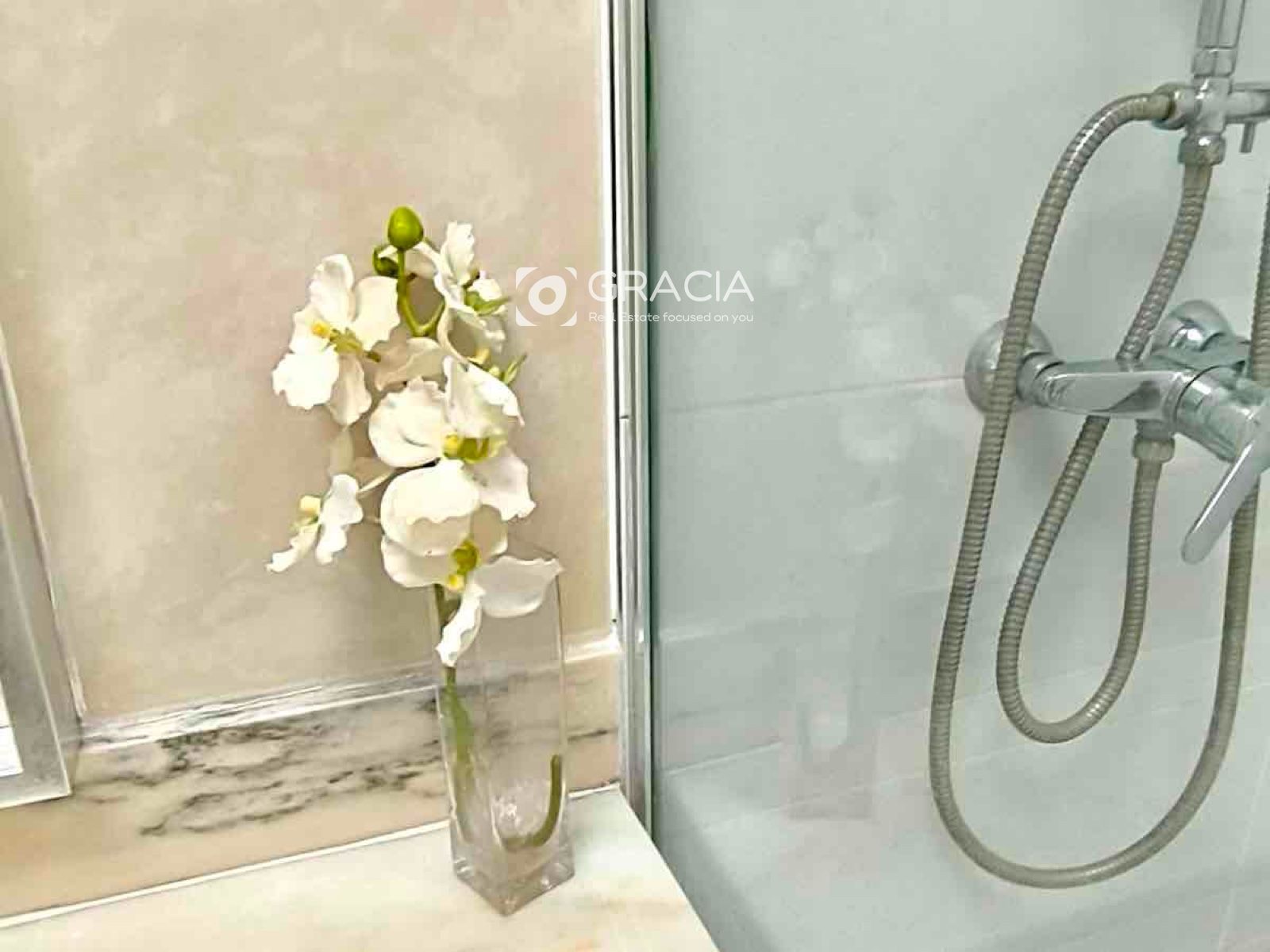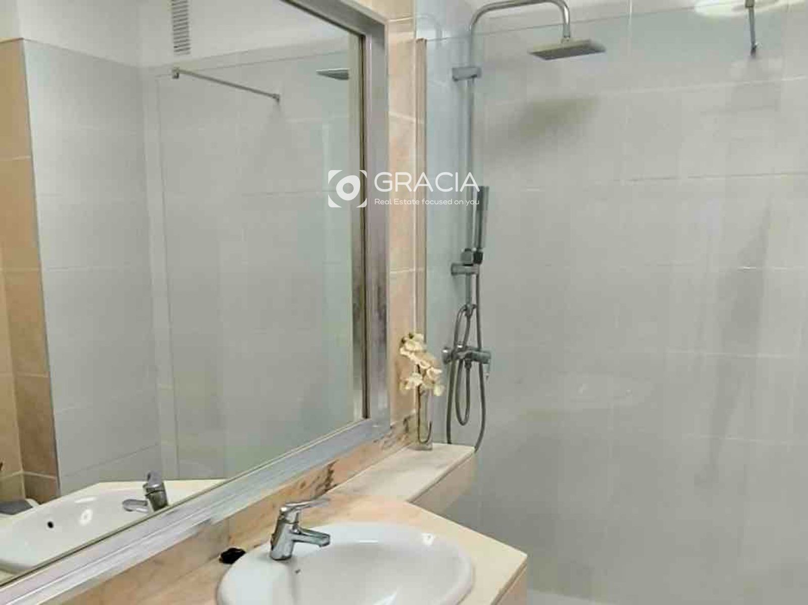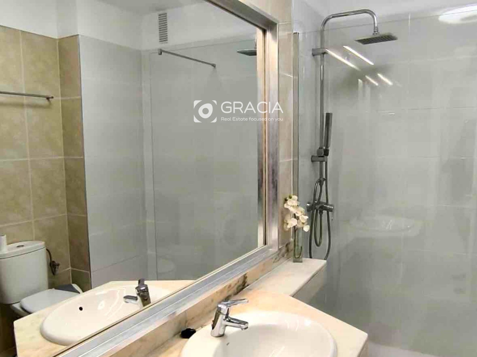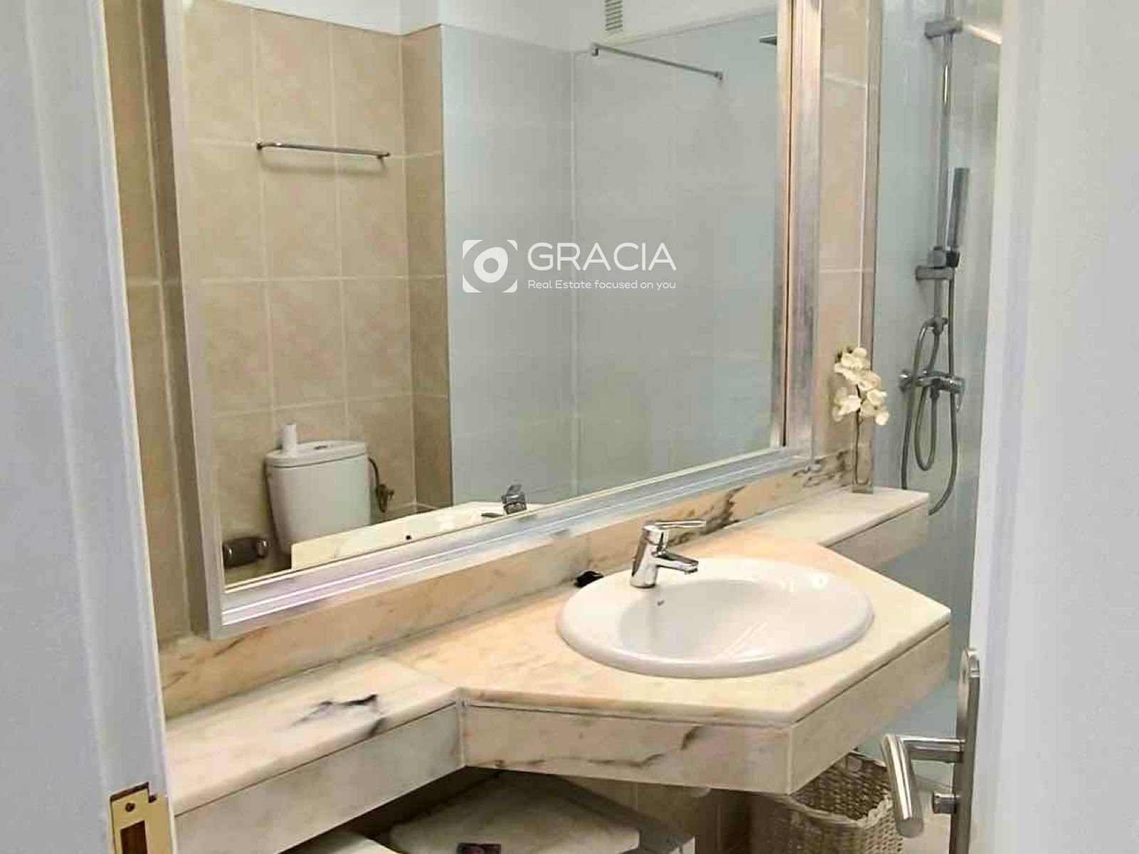 Ванная комната очень просторная и недавно отремонтированная, с удобной душевой кабиной на уровне пола для большего комфорта.